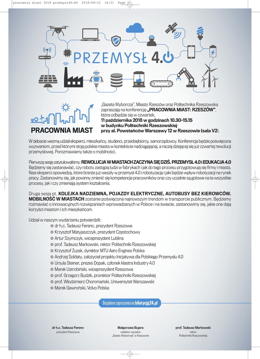 Gazeta Wyborcza, Miasto Rzeszów oraz Politechnika Rzeszowska zapraszają na konferencję „Pracownia miast: Rzeszów”, która odbędzie się w czwartek, 11 października w budynku Politechniki Rzeszowskiej przy al. Powstańców Warszawy 12 w Rzeszowie.